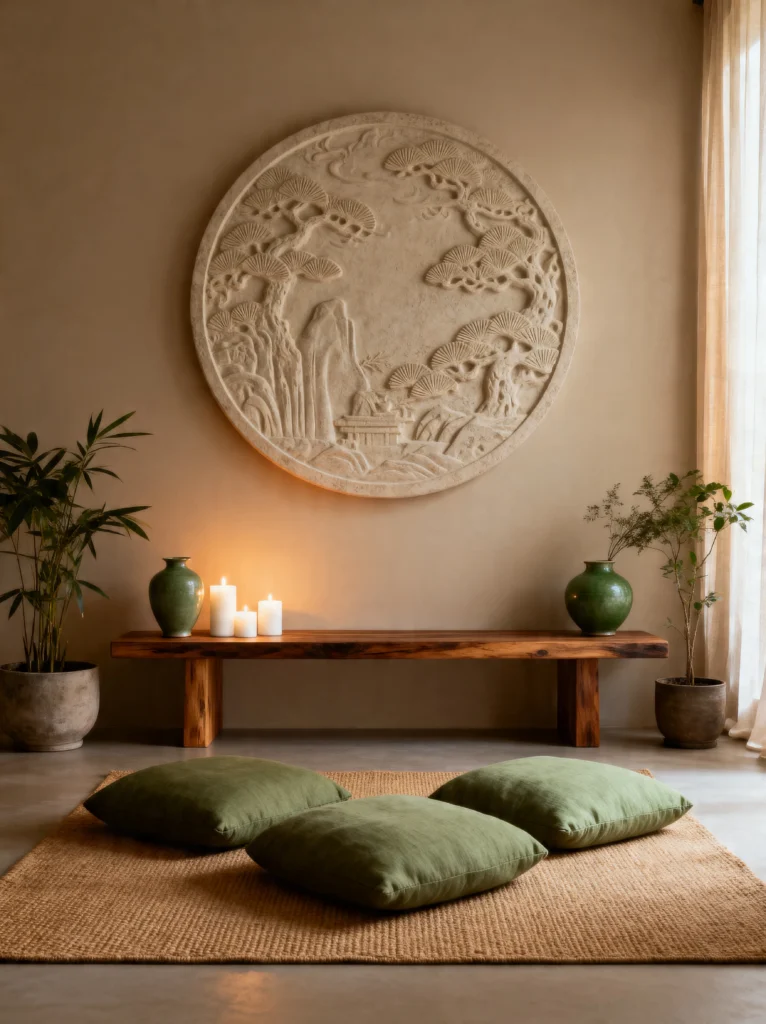 This room feels like a high-end spa, but in the best, most reachable way. The standout feature is that incredible circular wall relief depicting a traditional landscape with pine trees. It’s like a 3D window into another world, and because it’s the same sandy tone as the wall, it feels subtle rather than overwhelming.