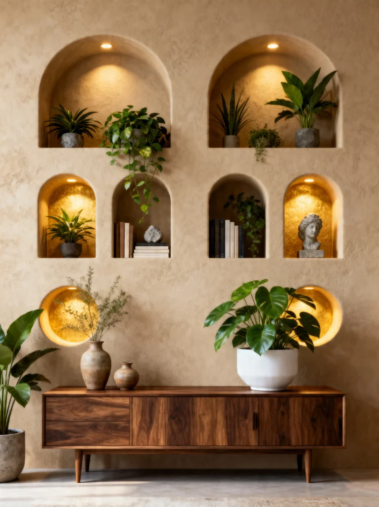 This is a closer, more minimalist look at the arched niche trend, and man, it is effective. By keeping the arches empty and just focusing on the light, the wall itself becomes a piece of art. The warm, down-lighting creates these beautiful “pools” of gold on the textured plaster.