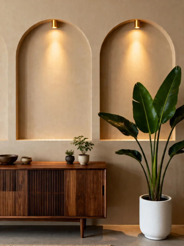 The slatted wooden sideboard underneath is a great choice—the vertical lines of the wood contrast nicely with the curves of the arches. I love the tiny details on top: two very small potted plants and a couple of simple ceramic bowls. It feels very “wabi-sabi”—finding beauty in the simple and imperfect.