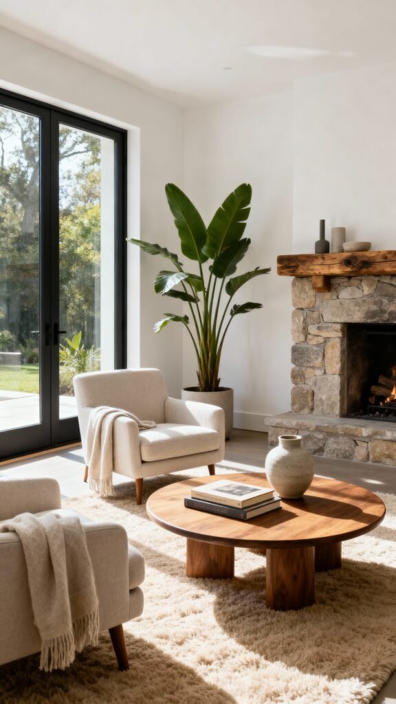 show a perfect blend of modern and rustic charm. The neutral color palette—creamy whites, soft beiges, and natural wood—creates such a serene, light-filled space. The stone fireplace is a fantastic focal point, bringing in a raw, organic texture that contrasts nicely with the clean lines of the furniture. Notice how the large sliding glass doors connect the interior with the outdoors, making the room feel even bigger and brighter!