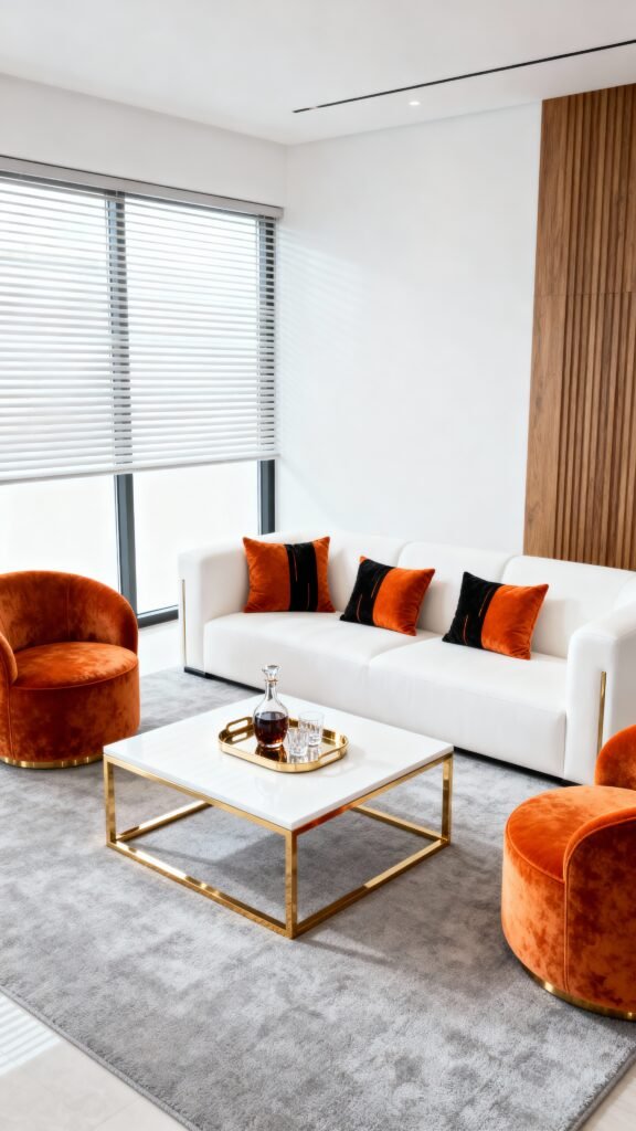 this room is all about chic sophistication! The contrast between the crisp white sofa and the rich, velvety orange accent chairs is just stunning. With the sleek gold accents on the coffee table and side tables, and that modern geometric pillow, it screams luxury. It’s a perfect example of how mixing bold textures and metallic finishes can create a high-end, contemporary feel without being over-the-top. The grey rug grounds the space beautifully.