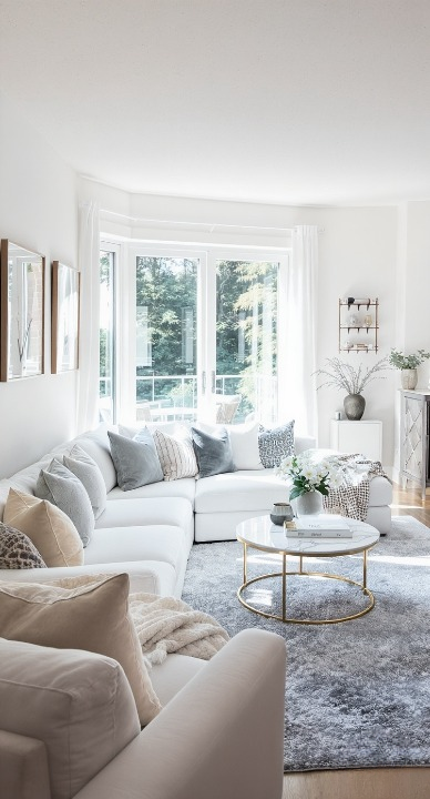 This living room is a breath of fresh air! The large sectional sofa in a crisp white is piled high with inviting pillows in soft neutrals and muted blues—so comfy! The large windows flood the space with natural light, highlighting the plush texture of the rug. A classic marble and gold coffee table adds a subtle touch of elegance without distracting from the overall bright and tranquil vibe. It’s perfect for lounging!