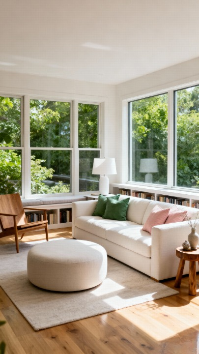 shows off a truly bright and blissful space, framed by those beautiful, expansive windows that bring the greenery in. The simple, light sofa and ottoman keep the focus on the natural light and the view. A pop of color comes from the playful pink and emerald green cushions. Plus, having a window seat with built-in bookshelves below? Genius! It adds character and a cozy spot for reading.