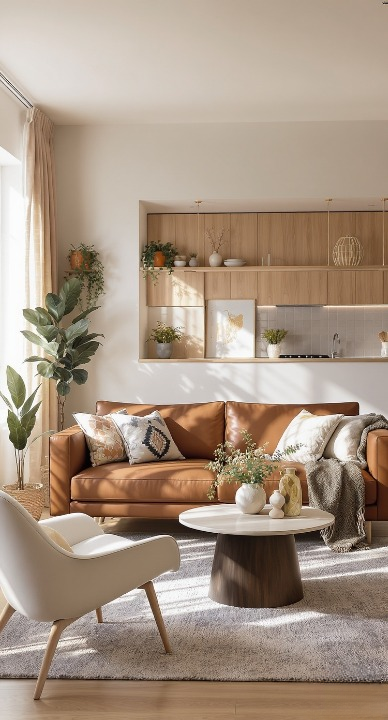 the gorgeous brown leather sofa is the star, grounding the room with its rich, warm color and texture. The natural wood tones in the open shelving and the light wood flooring create a continuous, inviting flow. Different patterns and materials in the pillows add depth, while the plants bring life. It’s a wonderful example of a perfectly balanced, earthy, and comfortable space.