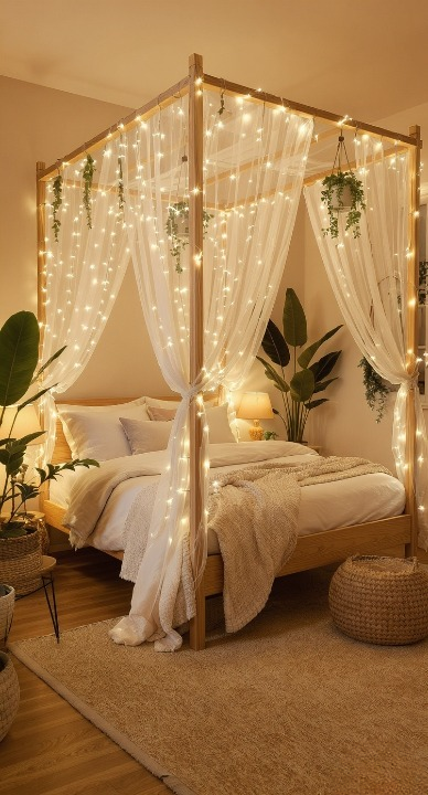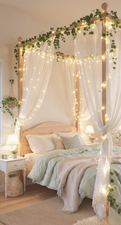 How completely magical is this? The canopy bed draped in sheer white fabric and twinkling fairy lights instantly creates a dreamy, ethereal feel. Adding the flowing ivy and greenery along the top really brings that perfect touch of nature indoors, making it feel like a secret garden escape. The light wood and pastel bedding keep the whole look soft and airy.