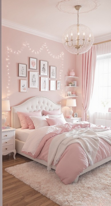 This is the definition of sweet and chic! The monochromatic light pink color palette is soft, feminine, and utterly charming. A plush, tufted white headboard, white bedside tables, and a fluffy shag rug add luxurious textures. The delicate string lights draped over the wall art and the grand chandelier elevate the whole space, making it feel elegant and dreamy.