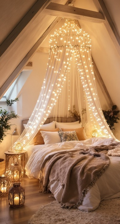 I adore how they turned this attic space into a romantic getaway! The vaulted, sloped ceiling becomes the perfect frame for the dramatic, cascading fairy light canopy. The warm, glowing light and the layers of soft, neutral bedding create such an intimate, snug atmosphere. The woven lanterns on the floor and side table add extra pockets of warm light and beautiful texture.