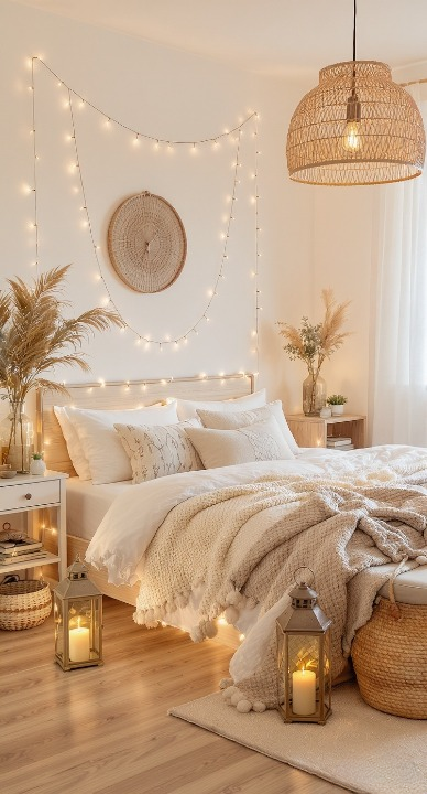 This room is a perfect example of bright, peaceful Boho style. The neutral color palette keeps the space feeling open and airy, while textures like the large wicker pendant lamp and woven wall hanging add character. The large, natural pampas grass and the brass-toned lanterns bring an elegant, earthy vibe. The simple strand of twinkling lights adds a gentle sparkle.