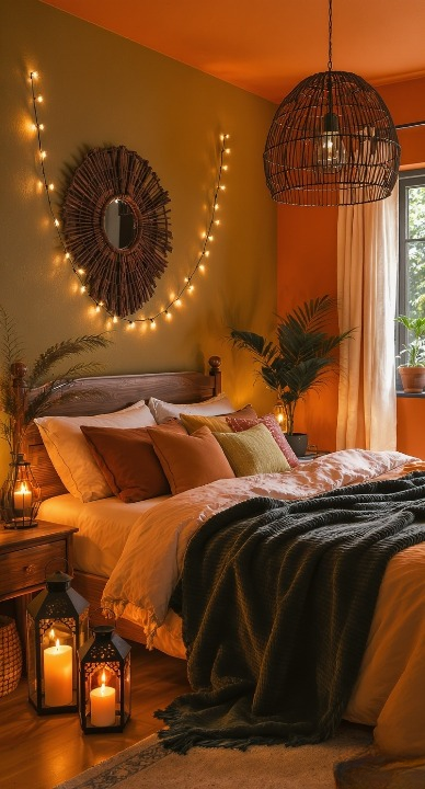 Talk about cozy! This room embraces rich, deep earth tones with a stunning combination of olive green and terracotta walls. The oversized, woven rattan pendant light and the dark wood furniture add beautiful texture. The layered bedding in burnt oranges and deep greens, combined with the scattered lanterns and string lights, makes this the ultimate bohemian retreat.
