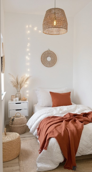 Even a small space can feel super cozy and stylish! This minimalist room uses a punch of terracotta orange in the blanket and pillow against a crisp white backdrop for a lovely contrast. The rattan light fixture and the wicker baskets add that essential natural texture. A simple vertical string of fairy lights in the corner is all it takes to add a touch of playful sparkle.