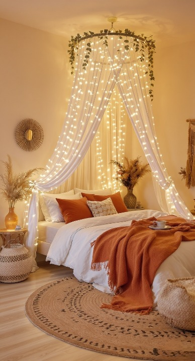 This is another great example of how a bed canopy instantly adds drama and softness. The glowing fairy lights create a warm, sunset-like ambiance, enhanced by the rich burnt orange bedding and accent pillows. The circular jute rug on the floor and the woven side table ground the look in natural, bohemian style, making this room a lovely, bright hideaway.