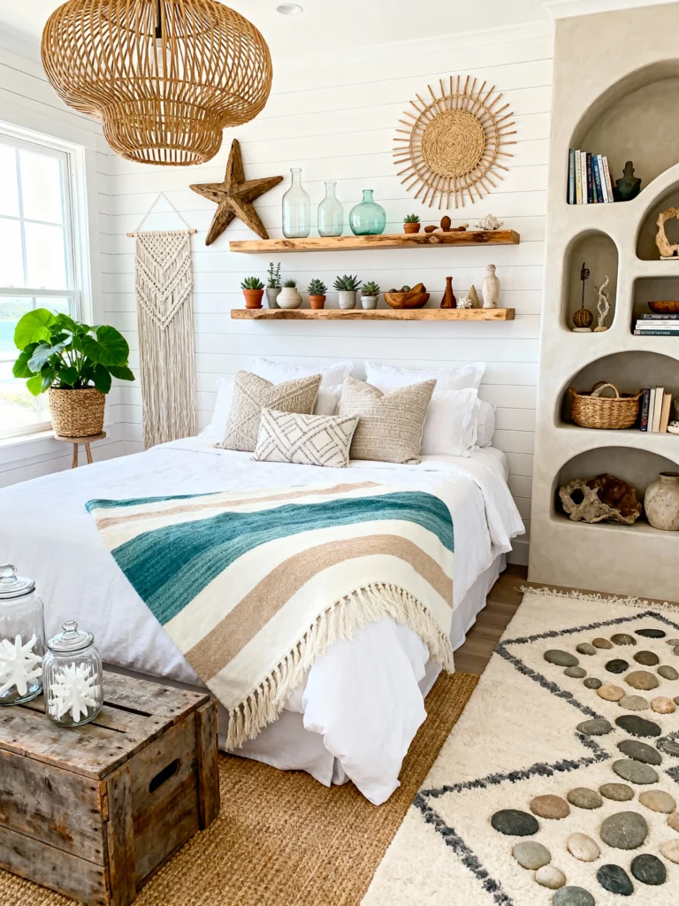 If I had to describe this room in one word, it would be texture. This is the ultimate, light-filled, modern boho-beach space. The first thing that catches your eye is that huge, woven basket light fixture—it’s a showstopper! Everything here is so bright, clean, and organic, with the crisp white walls and linens creating the perfect backdrop for all those beautiful natural materials. I love the simple, floating wooden shelves decorated with cute little succulents and sea-inspired glass. Plus, that built-in arched niche shelving is a unique architectural detail that adds so much character! The blanket with the teal and sandy stripes and the fun, natural-stone rug bring in the perfect amount of color and beachy vibe without overwhelming the calm atmosphere.