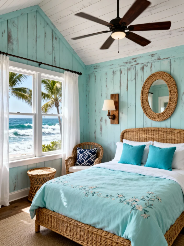 How incredibly cheerful is this room?! The distressed, light teal/aqua walls are the absolute focal point here and create a wonderfully immersive, tropical atmosphere. Paired with the white vaulted ceiling and the crisp white window trim, the color is vibrant without being overwhelming. The gorgeous view of the palm trees and crashing waves outside is basically a built-in piece of artwork! The rattan bed and chair are quintessential coastal pieces. I really like the detail on the duvet cover, which features simple, embroidered white flowers—it adds a delicate, feminine touch to the strong wall color. It truly feels like a quaint, luxurious beach cabana.