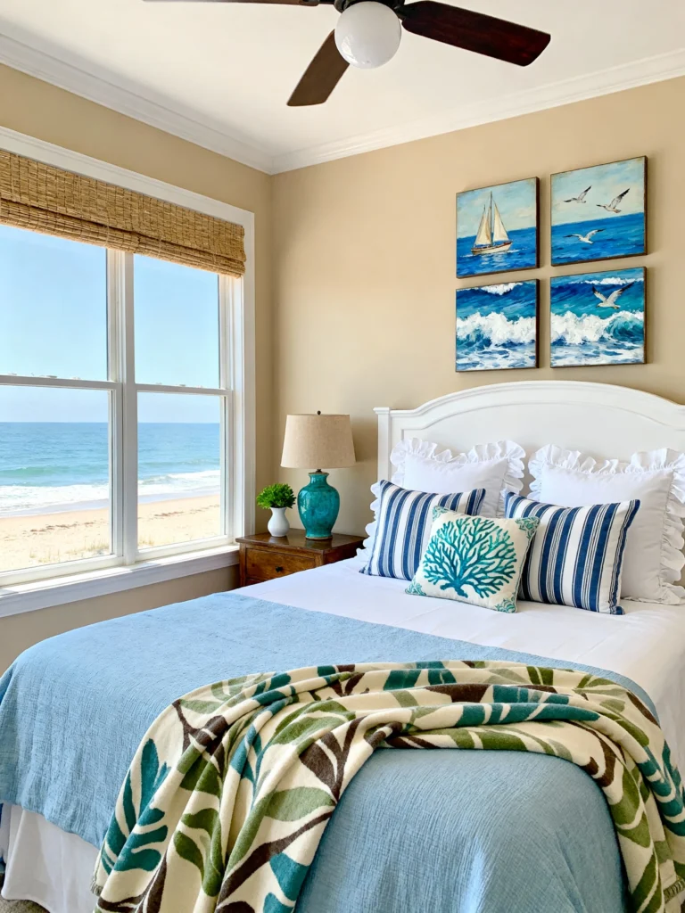 This bedroom has a warm, familiar, classic seaside cottage vibe. The walls are a soft, neutral beige which provides a calming backdrop for the blues and whites. The traditional white spindle bed frame and ruffled pillows are very charming. What really sets the mood is the gallery wall above the bed—the four small paintings of a sailboat, waves, and seagulls are pure coastal art. The layered bedding, featuring the light blue blanket and a fun, leafy, green and brown throw, adds a modern twist to the traditional palette. And how about that chunky turquoise glass lamp? It’s a fantastic splash of color that perfectly mimics the deep ocean water.