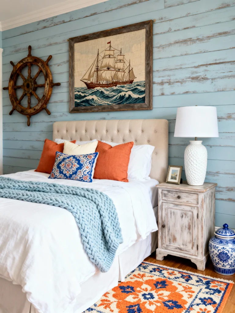 This bedroom perfectly nails the classic, vintage nautical theme. I am obsessed with that gorgeous, distressed, pale blue shiplap wall—it looks like something straight out of an old seaside captain’s cottage. The wooden ship’s wheel and the framed tapestry of the sailing ship anchor the whole theme beautifully. They balanced the rustic wood and blue tones with a cozy, tufted, neutral headboard and a thick, light blue knitted blanket. And check out that amazing orange and blue rug! It adds a surprising pop of warmth and ties in the vibrant throw pillows. It just feels so cozy, traditional, and welcoming. This is the perfect spot to curl up after a long day of “sailing” (or, you know, just working!).