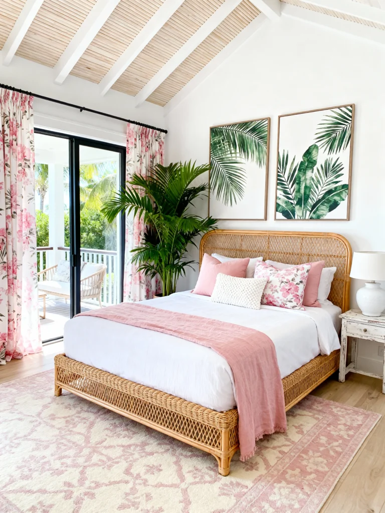Ooh, this is a fun twist on the usual coastal color palette! While it still has the bright white walls and a beautiful rattan bed, the introduction of soft, blush pink takes it in a wonderfully romantic, tropical direction. Those large framed prints of green palm leaves are fantastic and pop beautifully against the white wall. But the real star is the use of the pink floral pattern—on the pillows and those stunning full-length curtains! The curtains, in particular, frame the view out onto the deck so elegantly. It just proves that you don’t have to stick to just blue and white to get a beachy look. This room feels fresh, feminine, and utterly luxurious.