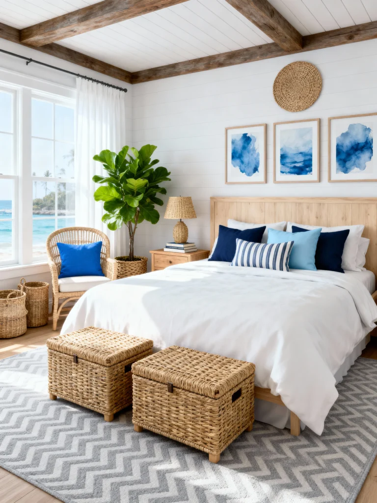 This bedroom strikes a beautiful balance between cozy New England cottage and tropical escape. The exposed wooden beams on the ceiling add a wonderful architectural touch and a bit of rustic charm. The color scheme is predominantly white, wood, and beautiful shades of blue, which gives it that classic coastal feel. The triple watercolor art above the bed is a simple, effective way to introduce the ocean’s palette. I love the addition of the large fiddle-leaf fig plant—it brings a much-needed burst of fresh greenery. Also, those woven trunk ottomans at the foot of the bed are genius for storage! The chevron patterned rug keeps the floor from feeling too plain, making the whole room feel grounded and stylish.