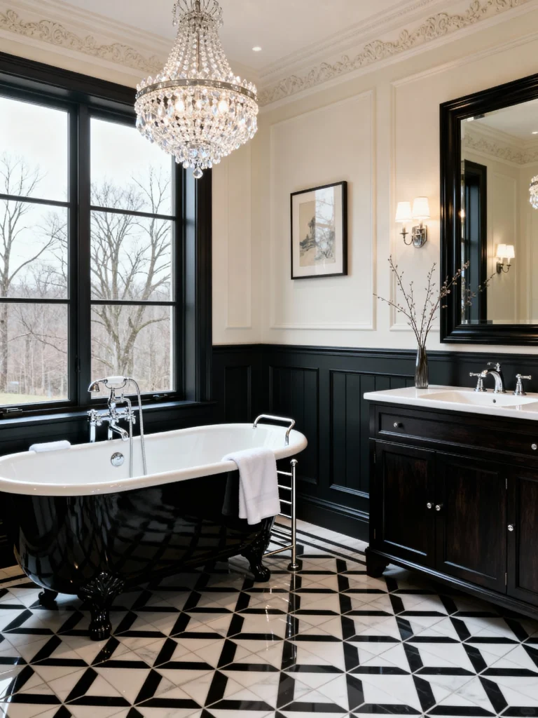This bathroom perfectly balances drama with sophistication using a striking black-and-white palette. The lower black paneling contrasted against the crisp white upper walls and crown molding is such a chic look, giving the room a sense of depth and structure. I love how the large black window frames the view like a piece of art—it’s just stunning! The black clawfoot tub anchors the space beautifully, and the geometric marble floor tile adds a playful yet classic touch that keeps the eye moving. Topping it all off is that gorgeous crystal chandelier, adding a layer of sparkle and refinement. It’s a masterclass in making high-contrast design feel inviting, not stark.