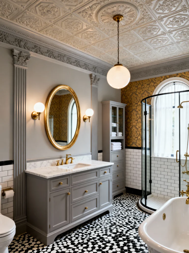 Now this is a playful and eclectic space! It manages to mix several distinct styles—check out that incredible embossed tin-style ceiling, which gives it a great vintage feel. The walls are a mix of elegant gray columns, classic white subway tile, and a bold, gold-patterned wallpaper. The focal point is definitely that vanity in a soft gray, topped with marble and highlighted by a gorgeous gold oval mirror and sconces. But the real surprise is the floor: a busy, beautiful black and white mosaic pattern that adds energy and fun. It shows you don’t have to stick to one era; blending different textures and patterns can create a truly unique and interesting room.