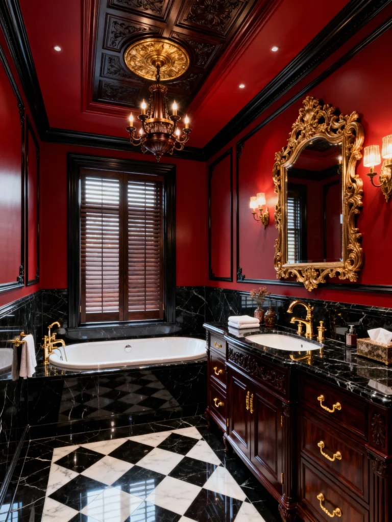 This is drama turned up to an 11. The combination of intense ruby red walls and glossy black marble is incredibly striking and luxurious. The black marble is used everywhere—on the floor, the countertops, and even the wall surround for the tub—creating a cohesive, high-end look. Against all that dark, rich color, the gold of the chandelier, mirror frame, and sink fixtures just pops. The vanity has beautiful, detailed woodworking that adds to the classic, luxurious feel. The checkerboard tile on the floor cleverly breaks up the solid black, adding a focal point and connecting it all back to that high-contrast theme. This is unapologetic glamour!