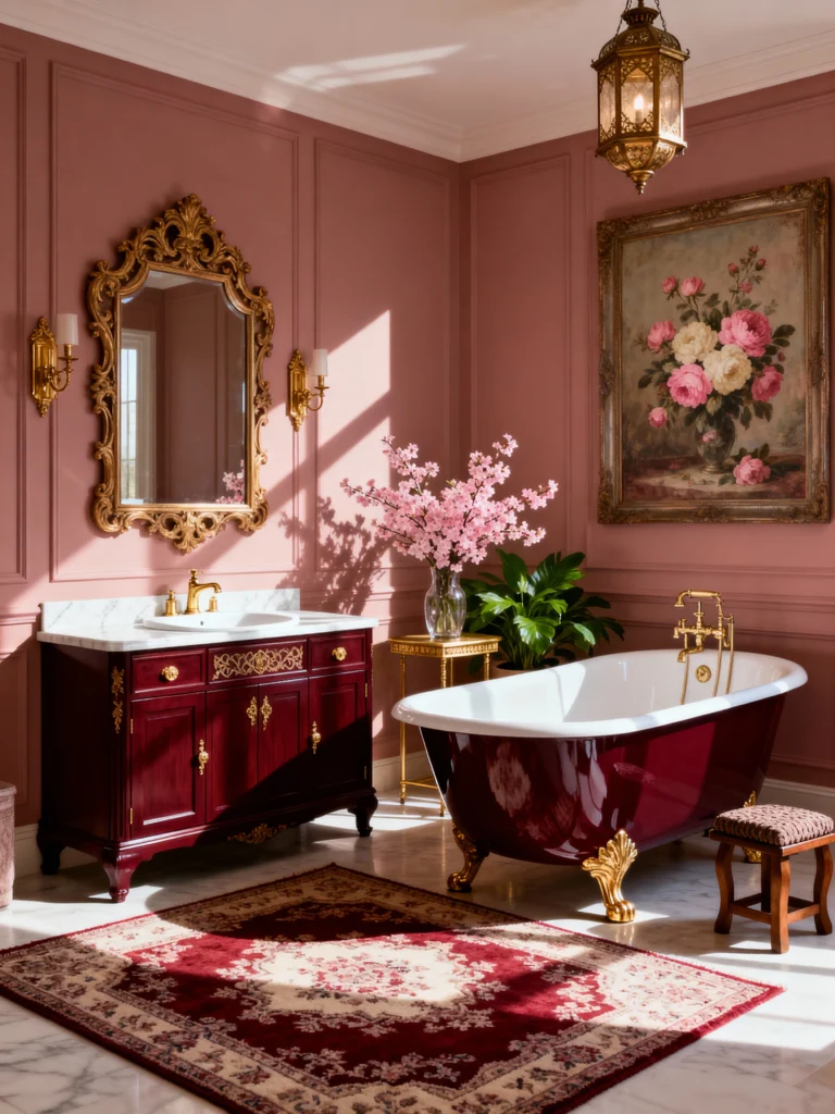 This is the epitome of soft luxury! The dusty rose paneled walls are simply divine and create such a warm, inviting glow, especially with that sun streaming in. It’s all about pairing soft pink with rich, deep red and classic gold. The deep cherry red vanity and the matching two-tone clawfoot tub are gorgeous statement pieces, grounded by the intricate rug and classic white marble floor. Everything is tied together with beautiful gold accents, from the mirror frame to the faucet hardware. That floral artwork and the delicate branches in the vase elevate the whole room, making it feel less like a functional space and more like a beautifully curated sitting room.
