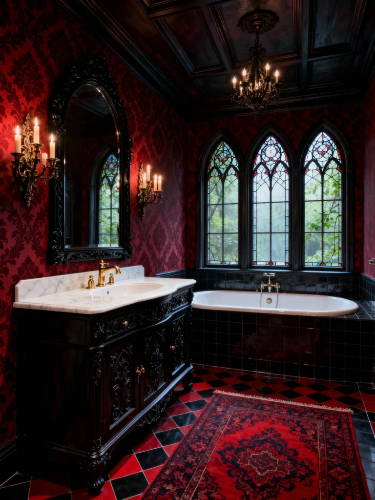 Okay, this one is for the true maximalist at heart! This bathroom leans fully into a moody, gothic romantic vibe, and I am here for it. The deep red damask wallpaper is so rich, and the dark wood paneling on the ceiling and vanity adds incredible texture. But the true stars are those stunning arched windows with the colorful stained glass—they bring in a magical light and an old-world cathedral feel. The black subway tile around the tub and the black and red checkered floor, warmed up by that patterned rug, make the space feel cozy despite the drama. With the intricate dark mirror and the flickering candle wall sconces, this space is less a bathroom and more a secret, luxurious sanctuary.