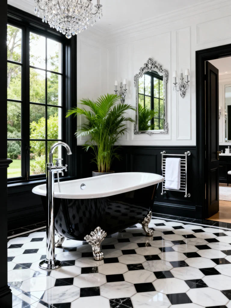 This design is so fresh and bright, mixing the classic black-and-white theme with some serious silver glamour! The oversized black-framed window and the dark wainscoting give it a strong, modern foundation, but then BAM—the silver details come in. The claw feet on the tub are super ornate and shiny, matching the elaborate silver mirror frame and the sleek towel warmer. That large hexagon marble floor is an absolute dream, connecting the white and black elements perfectly. And can we talk about that palm? A big, lush plant instantly makes a fancy room feel alive and welcoming. It’s a gorgeous mix of classic high-contrast, modern clean lines, and a touch of tropical flair.