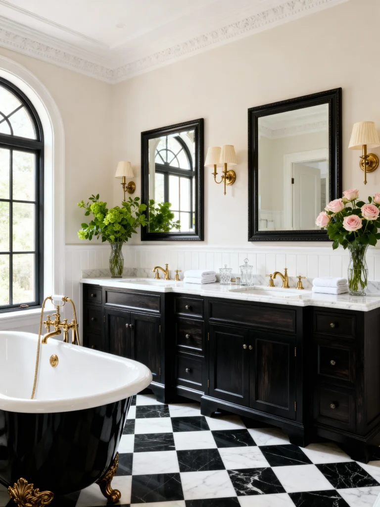 Everything about this room is pure sophistication! It uses a classic, understated color palette—soft cream walls and rich, dark espresso wood—to let the details shine. The floor is that stunning large-scale black-and-white checkerboard marble, which instantly elevates the entire room. The symmetry here is perfect, with two identical vanities, mirrors, and sconces, creating a calm, balanced feel. The brass fixtures add a pop of bright warmth against the dark wood. And notice the curved window! It’s such an elegant touch, flooding the room with light. The subtle fresh flowers and greenery make it feel totally polished and inviting—a perfect serene escape.