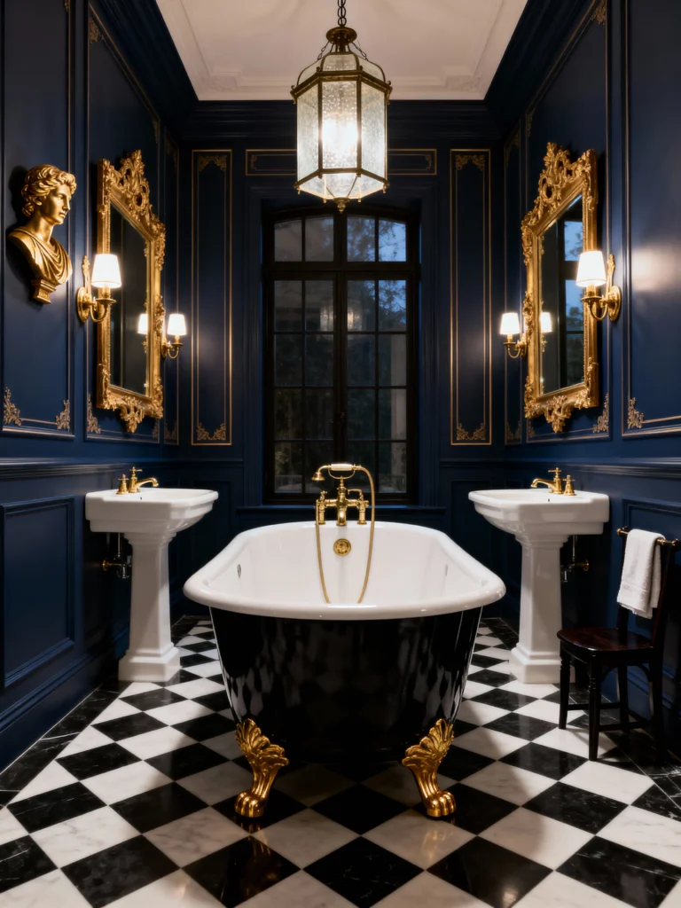 Prepare to be absolutely swept away by this sapphire blue stunner! The intense, deep blue paneling is breathtakingly beautiful, and the way it’s framed by all that gilded gold trim and ornate mirrors is just chef’s kiss. This room has serious presence! The classic black and white checkered floor and the central black and white tub with gold feet keep things grounded. I love the twin pedestal sinks; they keep the space feeling open and airy despite the deep wall color. That hanging lantern and the bust sculpture add a layer of classical artistry. This room feels like stepping into a perfectly preserved, elegant European estate.