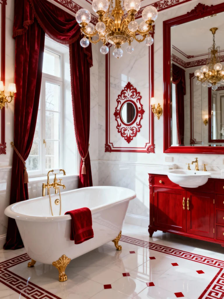 This room screams pure luxury and drama! The deep, velvety red curtains and cabinetry set a regal, almost theatrical tone, beautifully framed by bright white marble walls with contrasting red trim—it’s like a jewel box. I’m obsessed with the opulent gold chandelier and all the brass hardware on the clawfoot tub and vanity; it adds such a warm, expensive glow. And check out the floor! That white marble with the striking red Greek Key border is such a clever detail, really cementing that high-end, classic European feel. This isn’t just a bathroom; it’s a throne room for relaxation! It proves that being bold with color can create the ultimate luxurious retreat.