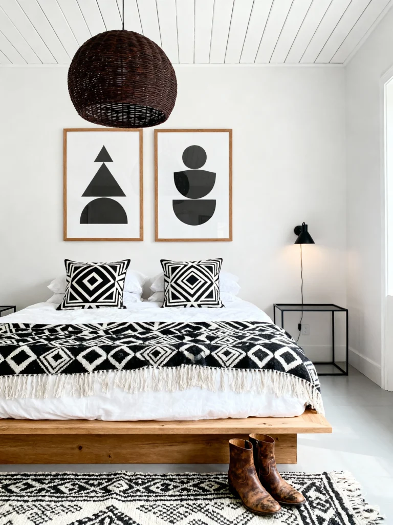 If you’re the type of person who needs a clear space to have a clear mind, this one is for you. This room is all about that low-profile wooden bed frame—it gives off such a grounded, peaceful energy. I love how the black-and-white geometric pillows add just enough “pop” without making the room feel cluttered. And can we talk about that oversized woven pendant light? It adds a touch of organic warmth to an otherwise very clean, modern space. It feels like the kind of room where you’d wake up feeling actually refreshed.