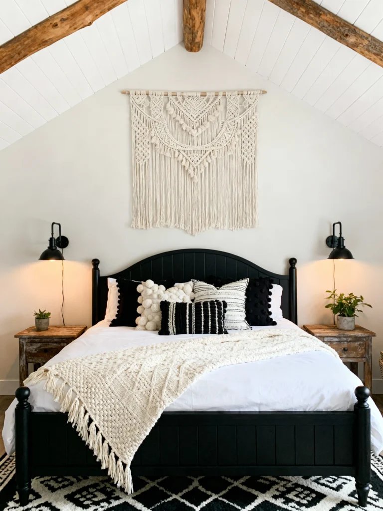 This room is the definition of “cozy-cool.” The star of the show is definitely that massive macramé wall hanging. It’s such a clever way to add art without the heaviness of a framed picture. By mixing the rustic wooden ceiling beams with a sleek black bed frame, the designer created a perfect balance between old-world charm and modern style. The layers of textured pillows make me want to dive right in and take a nap. It’s a space that feels handmade and full of heart.