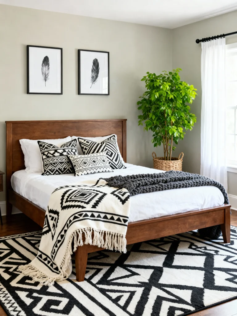 This room feels like a world traveler lived here. The rug is absolutely stunning—the warm earthy tones mixed with black and white give it such an authentic, global feel. By keeping the headboard a soft, neutral beige, the patterns on the pillows and the rug are allowed to be the main characters. It’s a great example of how you can use “Boho” elements while still keeping the overall vibe feeling tidy and upscale.