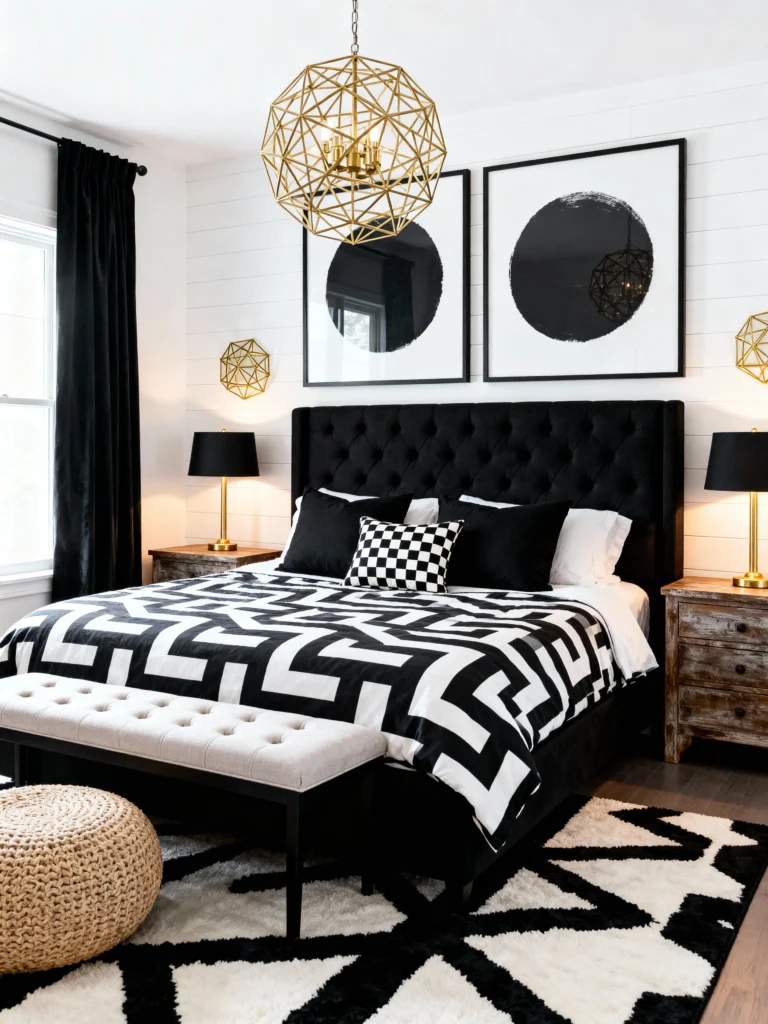 Okay, wow! If you want your bedroom to feel like a high-end boutique hotel, this is your blueprint. That black tufted wingback headboard is incredibly dramatic, and I am here for it. The gold “sputnik” style chandelier and the matching wall accents add that perfect touch of “glam.” It’s a lot of black and white, but the different patterns—the checkers, the Greek key throw, the geometric rug—keep your eyes moving. It’s bold, it’s brave, and it’s totally chic.