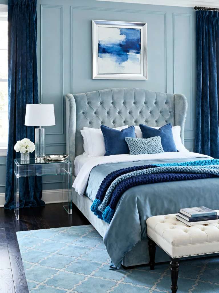 Blue is scientifically proven to be a calming color for bedrooms, but this room takes it to the next level. By using different shades of the same color (from the pale sky-blue walls to the deep navy velvet curtains), the room feels incredibly cohesive and expensive. That acrylic “ghost” nightstand is a genius move, too—it provides a surface for your lamp and books without visually taking up any space, making the room feel larger. This is pure sophisticated serenity.