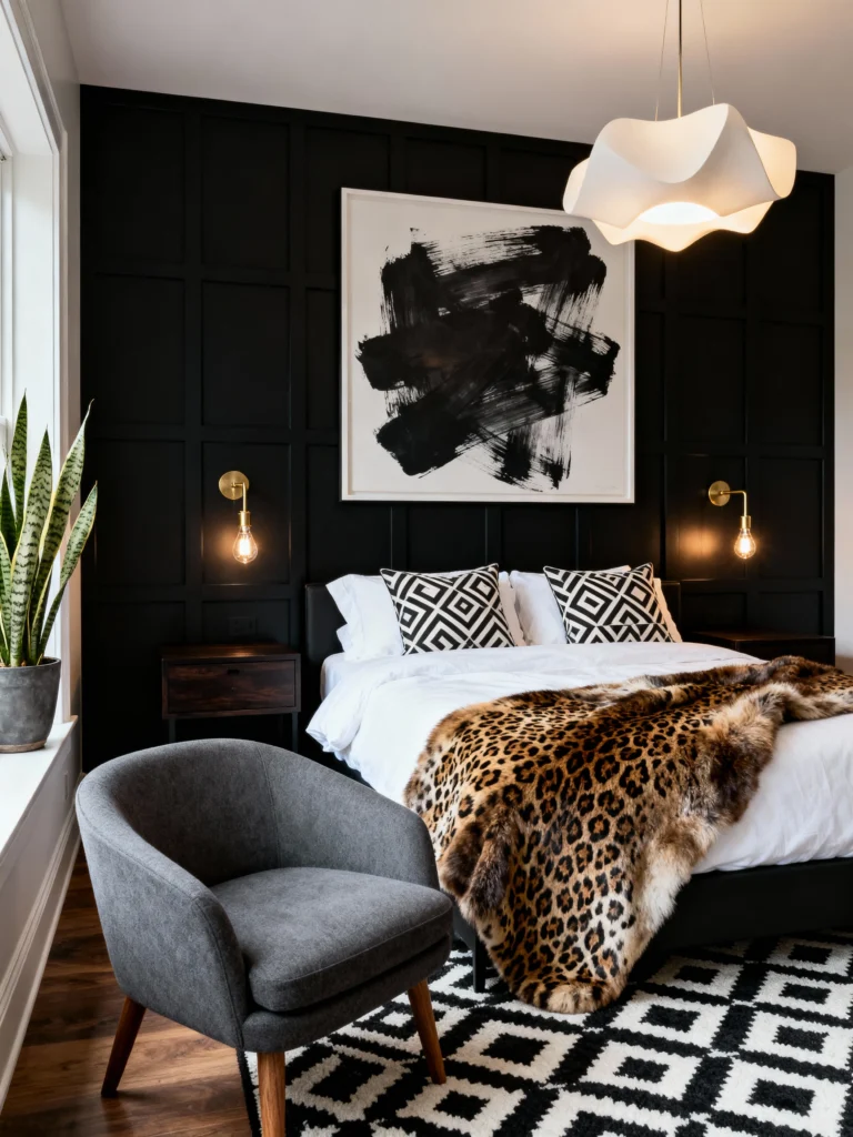 Who says small rooms can’t handle dark colors? This black-paneled accent wall is a total mood. It makes the white bedding and the large abstract art piece really “glow.” The leopard print throw adds a little bit of a wild, rock-and-roll edge that pairs perfectly with those minimalist Edison bulb sconces. It’s a little bit “Dark Academia” and a little bit “Modern Loft.” It’s the perfect sanctuary for a night owl.