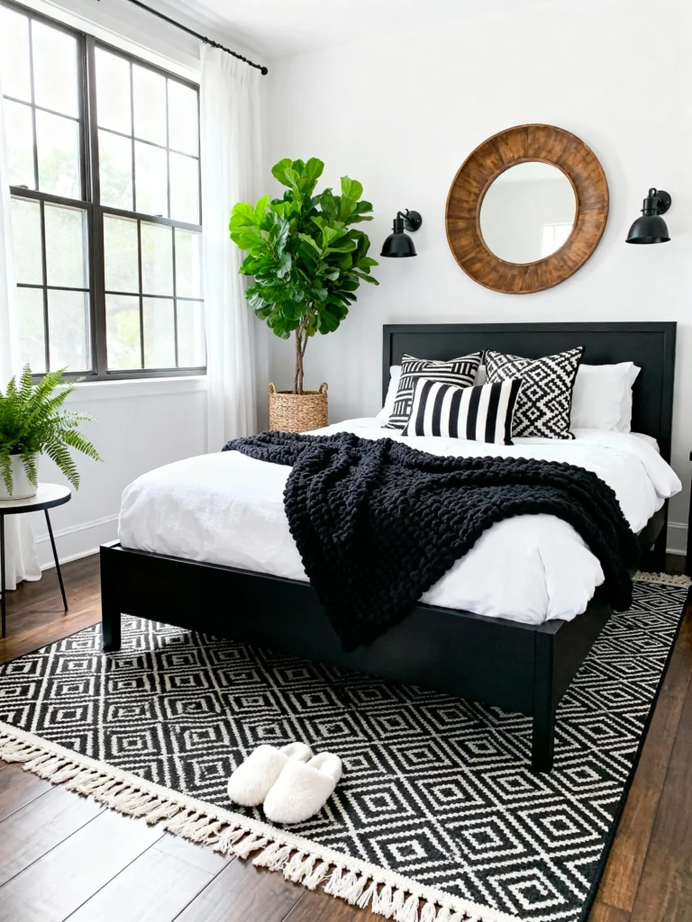 This is for the plant parents! The crisp white walls and black window frames provide a perfect “gallery” backdrop for all that greenery. What I love most here is the mix of shapes—you have the sharp lines of the bed and rug contrasted with that beautiful, round wooden mirror. It feels fresh, bright, and airy. It’s the kind of room that makes you want to pull back the curtains and let the sunshine in every single morning.