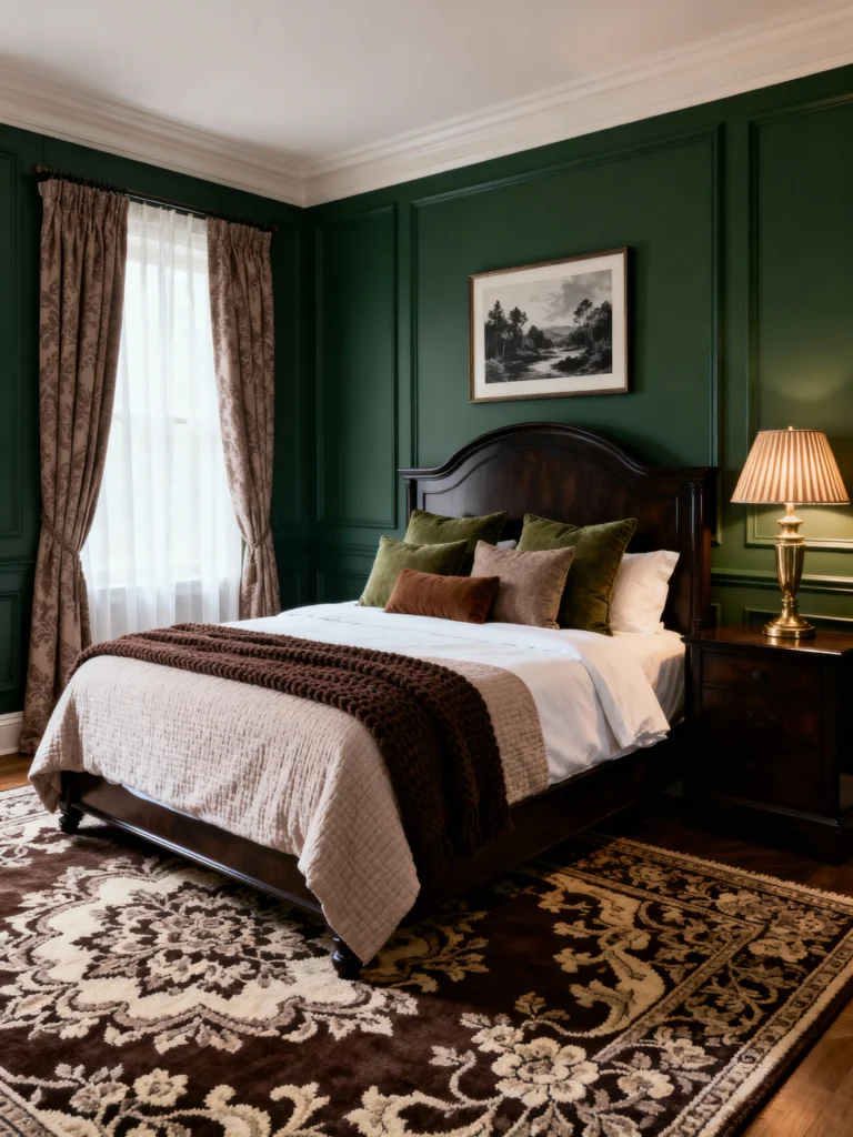 Final stop: pure luxury. Deep emerald green walls paired with dark wood furniture is a classic combo that never fails. This room feels like a cozy library that you can actually sleep in. The traditional rug and the pleated lampshade give it a very timeless, “old money” aesthetic. If you want a room that feels warm, grounded, and incredibly private, going for these deep, saturated tones is the way to go.