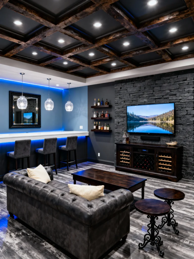 Ever wanted a private lounge that feels like a hidden speakeasy? This space nails the “modern moody” vibe. The star of the show is definitely that coffered ceiling with the dark wood beams—it adds so much architectural depth. But check out that blue LED backlighting! It gives the bar a futuristic glow that contrasts perfectly with the rugged stacked-stone TV wall. It’s the perfect mix of textures: soft leather, cold stone, and warm wood. If I were here, I’d be perched at one of those velvet stools with a drink in hand.