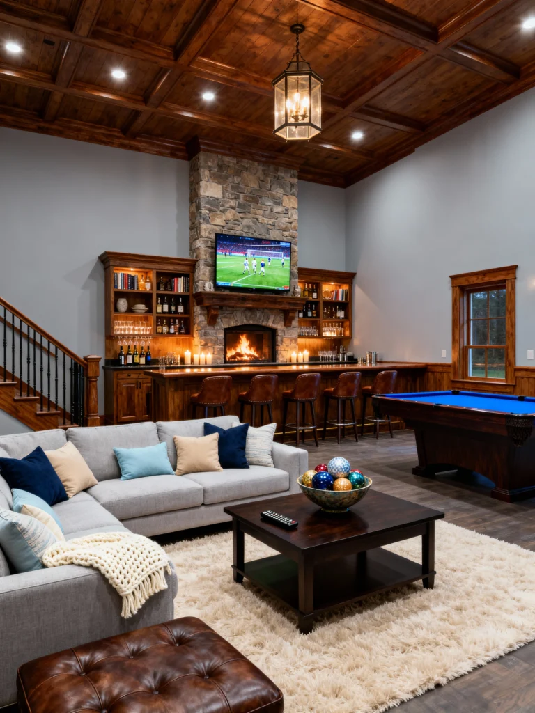 Okay, this is the “Go Big or Go Home” basement. It’s basically a high-end mountain lodge right in your house. That floor-to-ceiling stone fireplace is an absolute showstopper, especially with the TV mounted right above the hearth. Between the full bar, the pool table, and the massive sectional, it’s the ultimate entertainment hub. The dark wood coffered ceiling makes it feel incredibly expensive and cozy at the same time. It’s definitely the house everyone wants to go to for the big game!