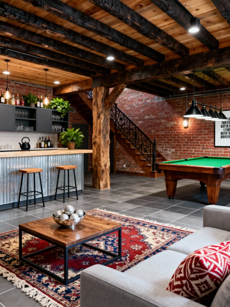 If you love the “Modern Farmhouse” look, this is your dream basement. The massive, hand-hewn timber pillar and ceiling beams give it so much character—it feels like an old barn turned into a luxury hangout. The corrugated metal on the bar adds a nice industrial touch, while that vibrant red Persian rug brings in some much-needed warmth. It’s the kind of place where you’d actually want to spend a rainy Saturday shooting pool and just hanging out with the family.