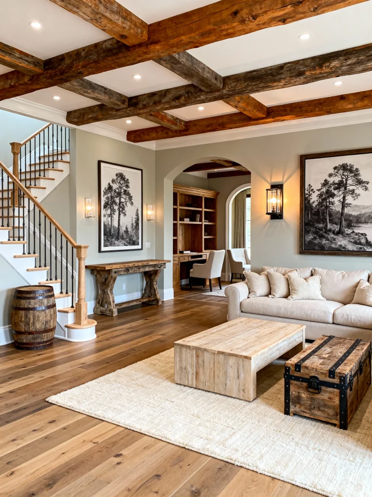 Can we talk about how bright this is? You’d never even know this was a basement. By using a light, sandy color palette and open archways, the space feels massive. The reclaimed wood beams on the ceiling provide a nice “anchor” to the room so it doesn’t feel too floaty. I’m also obsessed with the little details here, like the wooden barrel by the stairs and the vintage-style trunks. It’s sophisticated but still feels like a place where you can actually kick your shoes off.