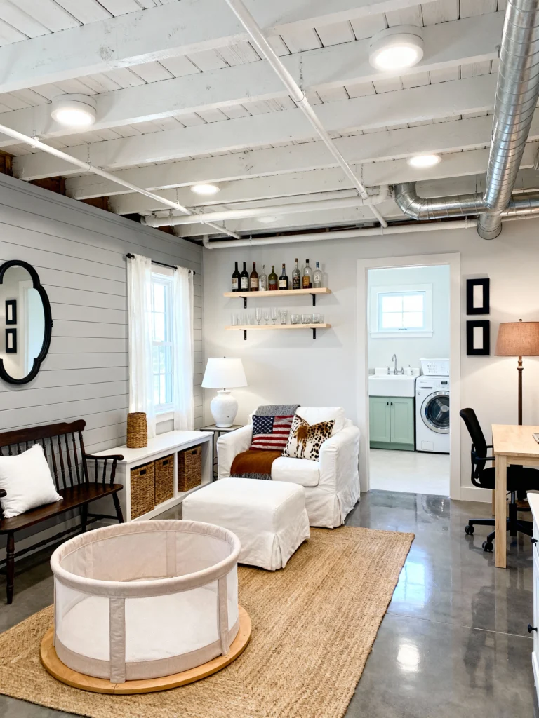 This is proof that a basement can be functional and cute. It’s a laundry room, a home office, and a playroom all rolled into one. The white-painted joists on the ceiling are a great trick—they keep the industrial “exposed” look but make the room feel much taller and cleaner. The shiplap wall adds a bit of coastal charm, and the neutral rug makes the polished concrete feel way more inviting. It’s a hardworking space that doesn’t sacrifice style.