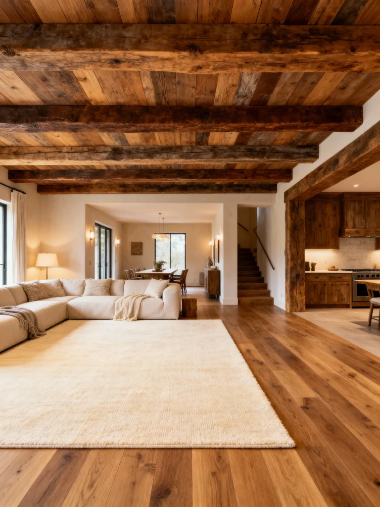 This space is all about the “Quiet Luxury” trend. It’s incredibly spacious and uses a monochromatic palette to keep things calming. The floor-to-ceiling wood accents and those chunky beams create a really seamless flow between the kitchen and the living area. It feels very organic and grounded. If you have a large footprint to work with, keeping the colors light and the materials natural (like that plush cream rug) is the way to go to keep it from feeling like a cave.