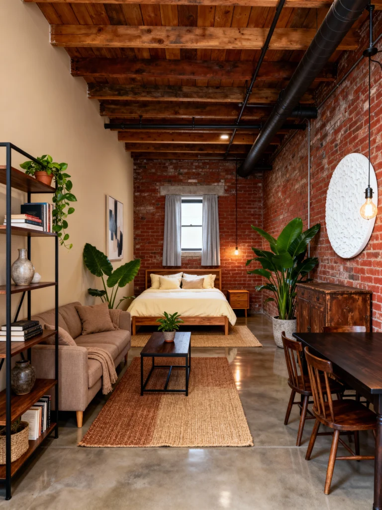 This looks like a trendy Brooklyn studio! Using the basement as a guest suite or a studio apartment is a genius move. The exposed red brick and the black piping on the ceiling give it that iconic industrial edge, but the potted plants and the warm wood furniture soften it up beautifully. The layout is super smart, too—using area rugs to “zone” the living area from the bedroom area makes the open floor plan feel organized and cozy.