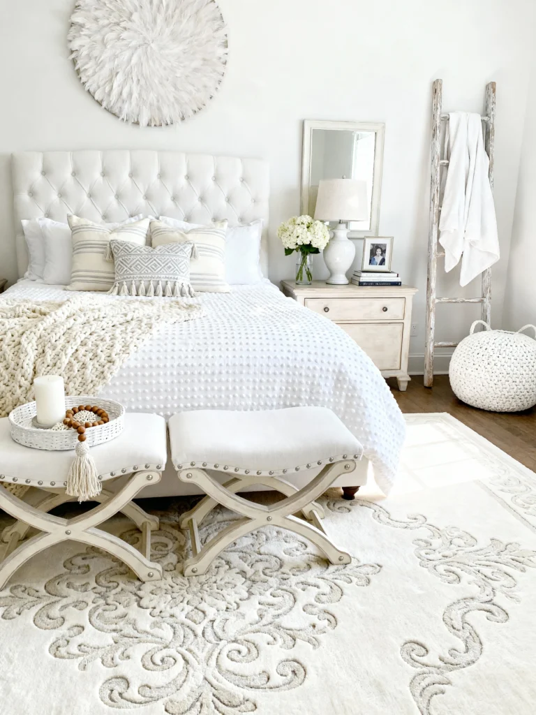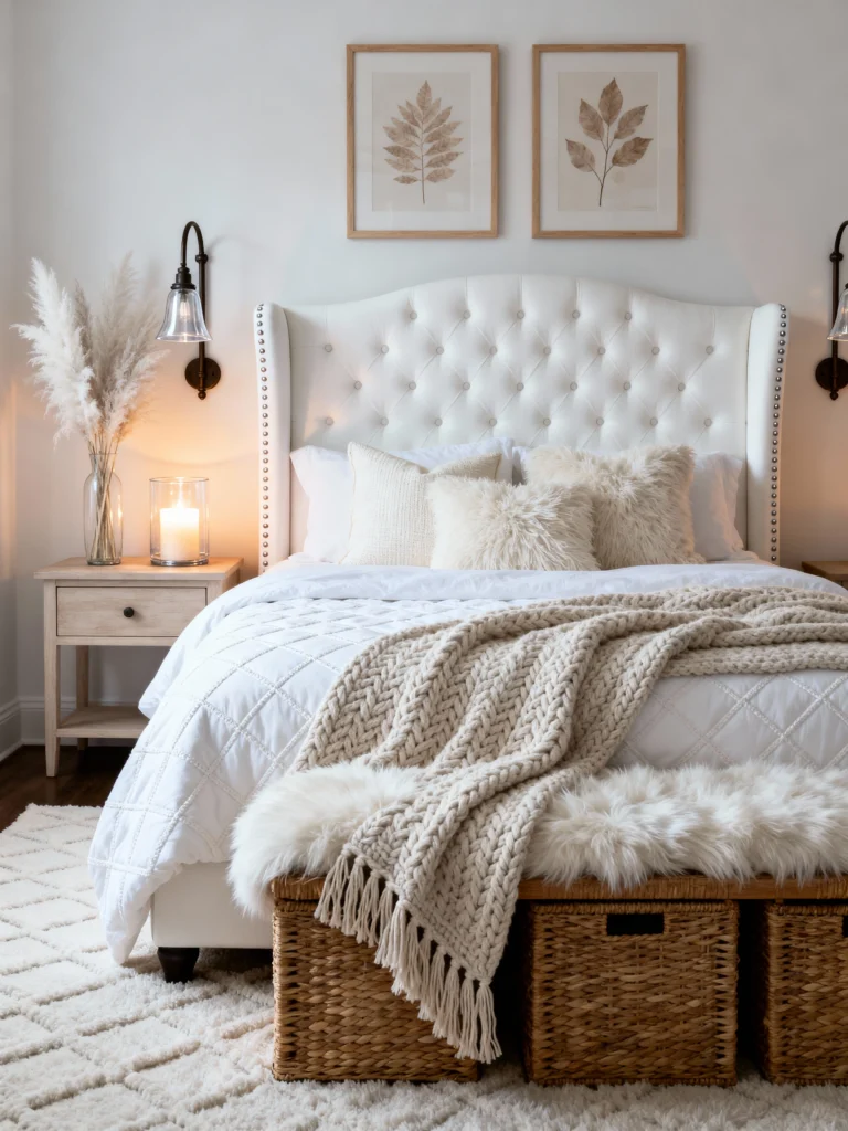 Finally, we have a version that feels a bit more bohemian and “boho-chic.” The woven baskets at the foot of the bed and the pampas grass in the corner bring in those natural, sandy tones. The quilted bedding and the shaggy rug make it look incredibly “touchable.” If you’re worried about white feeling too “stiff,” this is the way to do it—mix in woods, grasses, and knits to keep it grounded.
