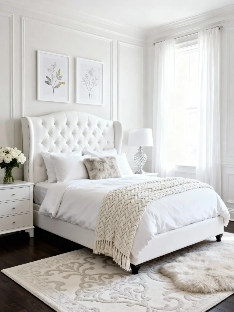 This one feels a bit more “grown-up” and sophisticated. The winged, tufted headboard is the star here—it frames the bed so beautifully. Notice the subtle wall molding; it adds a layer of architectural detail that makes the white walls feel high-end. I love the addition of the crystal lamp and the fresh white roses. It’s proof that you can stay within a monochromatic theme and still have a room that feels incredibly lush and full.