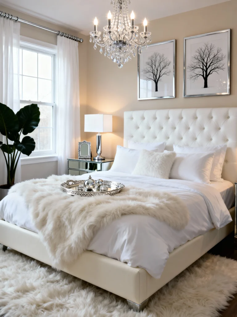 If you like a little sparkle, this is your vibe. This room leans into glam with a gorgeous crystal chandelier and mirrored nightstands. To keep it from feeling cold, they’ve layered on a super-plush faux fur rug and a matching fur throw. The warm lighting from the bedside lamp makes the cream tones pop against the white bedding. It feels like a high-end boutique hotel suite that you never want to check out of.