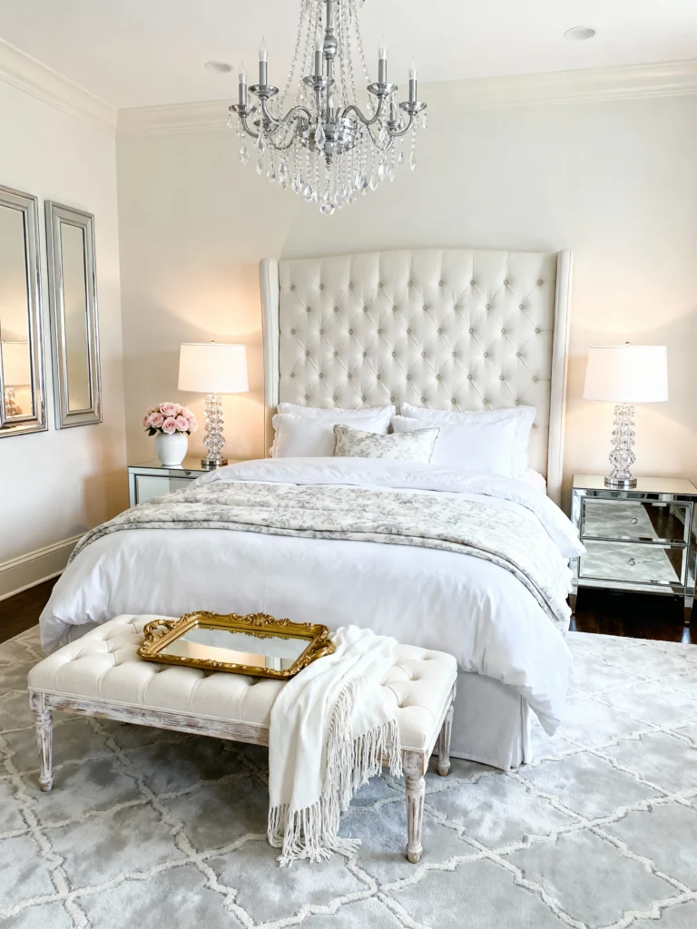 This headboard is everything! Going extra tall with your headboard is a great trick if you have high ceilings. It creates a sense of drama without needing bold colors. The mirrored furniture returns here, but the addition of a vintage-style gold tray on the bench adds a tiny wink of metallic contrast. It’s a very “regal” take on the all-white trend that feels timeless and sturdy.