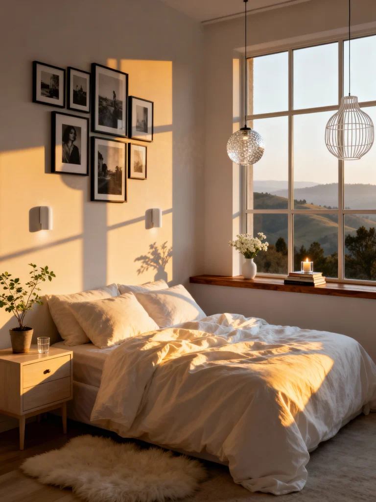 This room shows how much lighting matters. Even a stark white room can turn into a warm, golden sanctuary as the sun goes down. I love the gallery wall of black-and-white photos; it gives the space a personal, “lived-in” feel. The simple wooden ledge by the window is a great touch for keeping books and candles. It’s less about “decorating” and more about creating a mood.